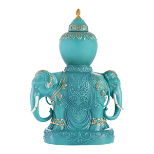 作品描繪大象家庭和樂融融,瀑布象徵充沛財源,象背上歡快的小猴寓意向上封侯,意境熱鬧而豐盛,象徵家庭圓滿、事業有成,享受和樂人生。