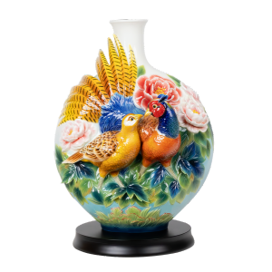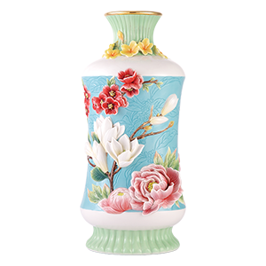 富富貴貴 紅龍魚瓷瓶 尊貴紅龍魚常為人們視為可旺家鎮宅,是身份與地位的象徵。本件瓷瓶以雙隻紅龍魚為主題,並搭配雙朵盛放的富貴牡丹,傳遞富貴雙雙之意。 瓷瓶以時尚藍為底色,並浮雕牡丹花草為圖紋,整件作品置於廳堂,將帶來滿滿喜樂之祝福。