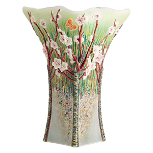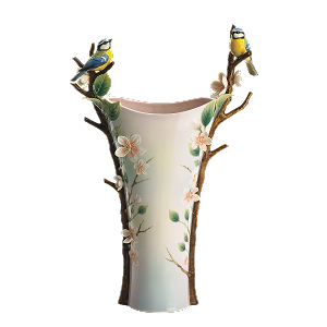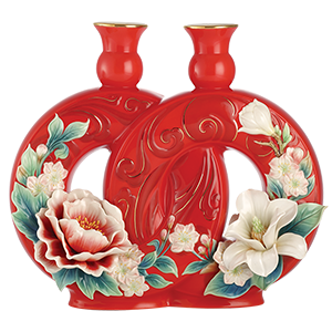 長伴久久 文鳥與紫丁香瓷瓶 取國立故宮博物院收藏之清郎世寧〈畫仙萼長春〉冊之〈紫白丁香〉圖為創作靈感。 雙隻文鳥相依相偎,長相廝守。瓷瓶特意以交錯瓶頸為設計,詮釋雙鳥之間的纏綿情意。枝頭上,紫白丁香綻放滿園,芬芳馨香悠然飄送,彷彿來自天庭般的溫暖祝福,期許此份真摯情誼天長地久。
