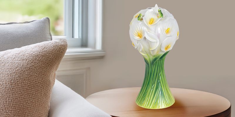 數朵海芋盛開成球,凝結為真摯的祝福。雨蛙躍然瓶側,靈巧生動,如幸運與轉機的化身。作品寓意未來步步高昇、榮耀可期。